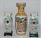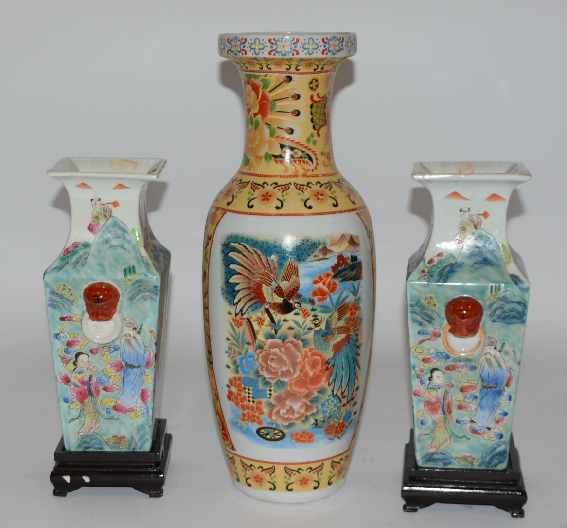Lotto composto da un vaso a soggetto naturalistico e una coppia di vasi in porcellana a base quadrata con basamento in legno, Cina, sec. XX (h cm 45 e 33) (difetti)