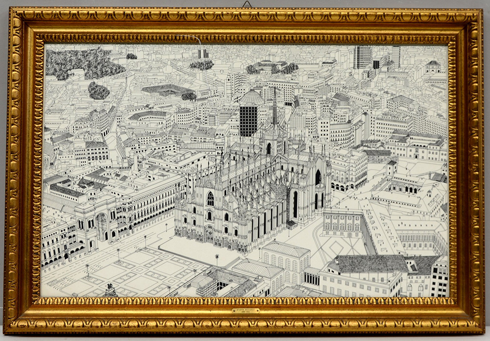 Riccardo Stoppa "Piazza del Duomo di Milano", china nera su cartoncino (cm 48x73), in cornice (lievi difetti)