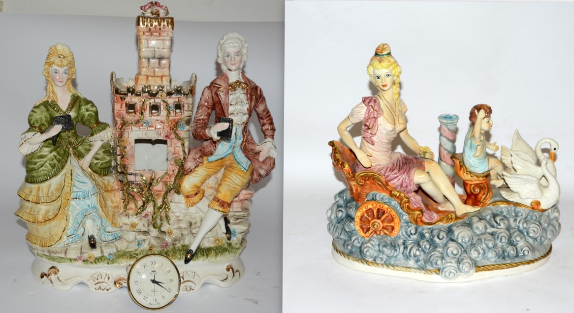Lotto di due gruppi plastici in ceramica policroma (h max cm 57) (difetti)
