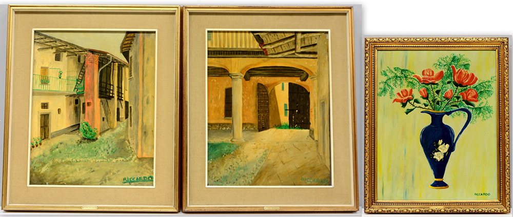 Riccardo Stoppa Lotto di tre dipinti ad olio su tela raffiguranti fiori e paesaggi, misure differenti, in cornici (lievi difetti)
