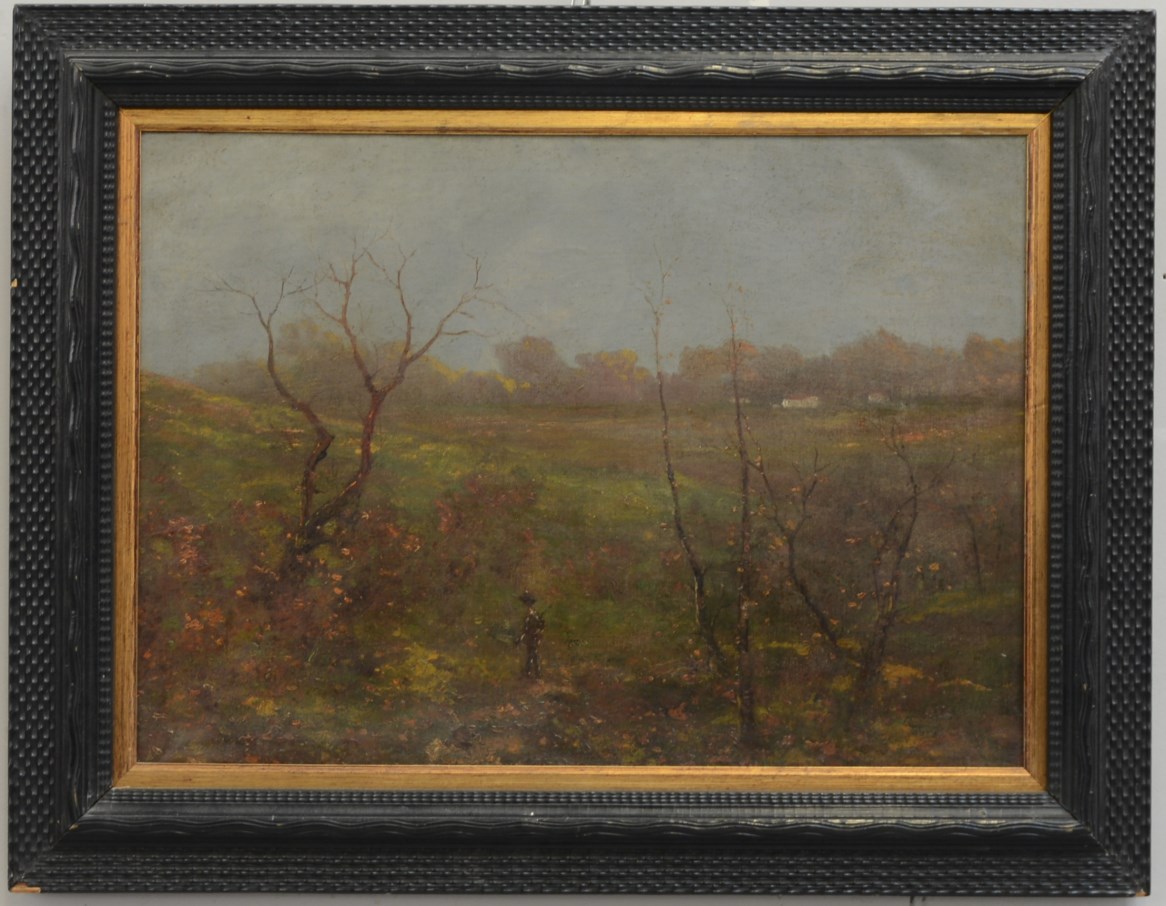 Lorenzo Gignous Modena (1862- Porto Ceresio 1958) Scuola del secolo XIX "Figura in un paesaggio" olio su tela (cm 46x68). In cornice