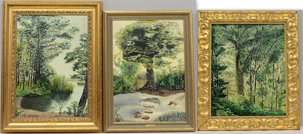 Riccardo Stoppa Lotto di tre dipinti ad olio su tela raffiguranti paesaggi con alberi, misure differenti, in cornici (lievi difetti)