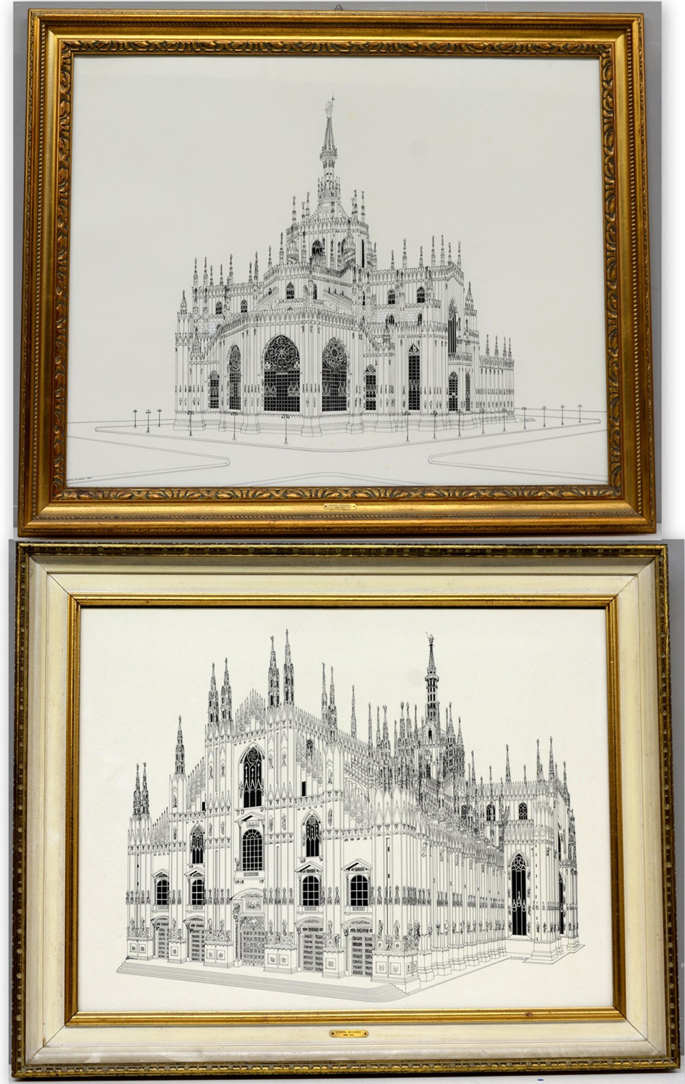 Riccardo Stoppa "Duomo di Milano", lotto di due disegni a china nera su cartoncino (50x66 e 64x79), in cornici (lievi difetti)