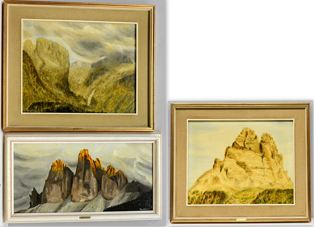 Riccardo Stoppa Lotto di tre dipinti ad olio su tela raffiguranti gruppi montuosi, dimensioni differenti, in cornici (lievi difetti)