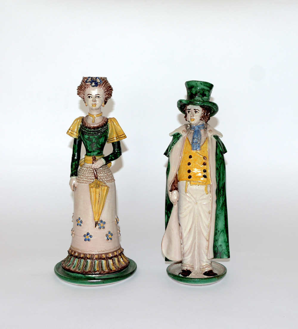 Manifattura di Caltagirone, lotto di due statuine portaceri in ceramica policroma raffiguranti un uomo e una donna, produzione recente (h cm 38) (difetti)