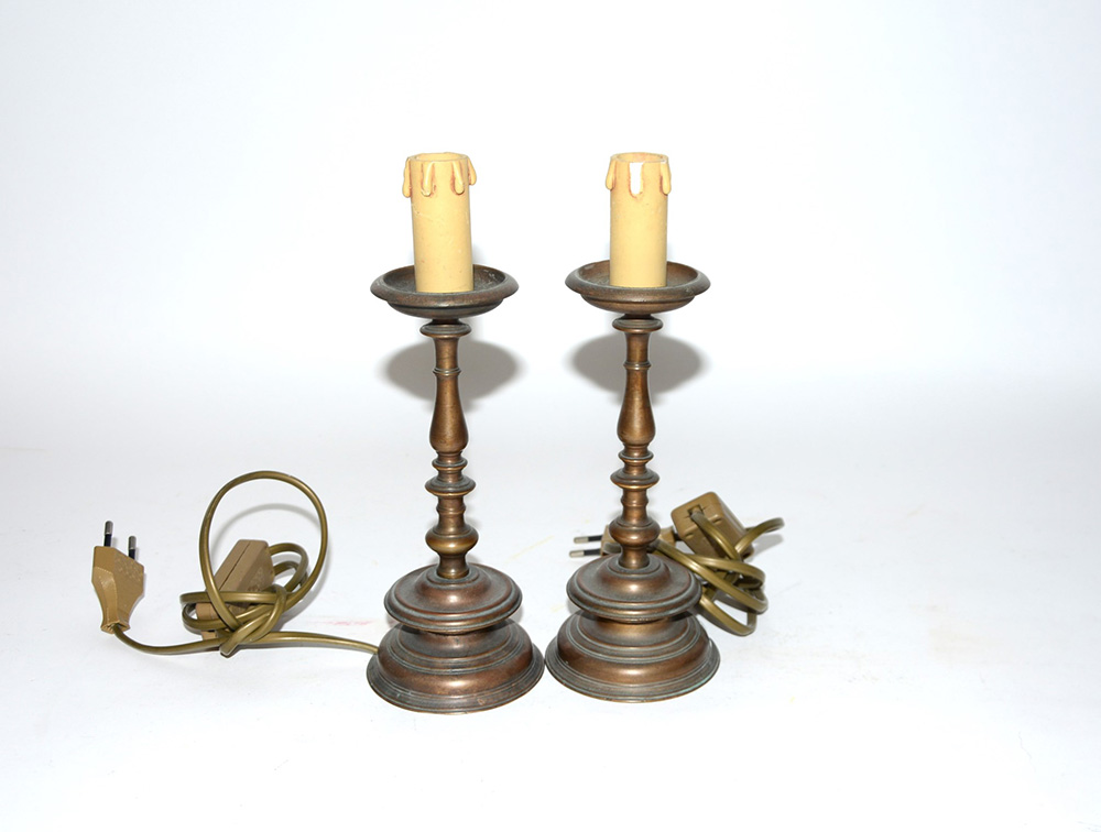 Lotto 3161 | Coppia di candelieri in bronzo adattati a luce elettrica (h cm 20) (difetti)