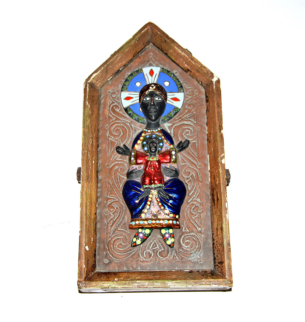 Icona orientale in metallo e smalti raffigurante Madonna con Bambino entro...