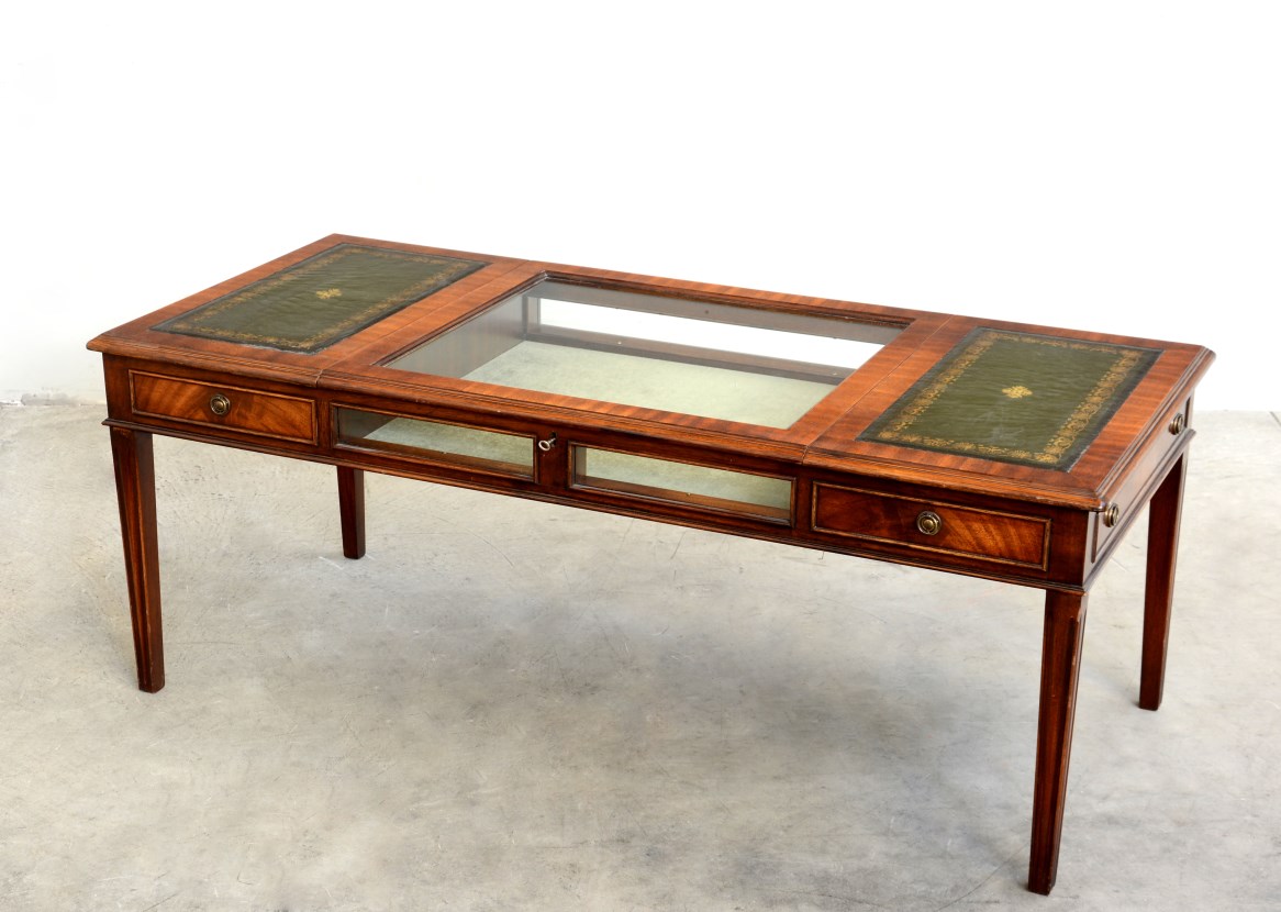 Tavolo vetrina in stile inglese a due cassetti laterali e anta centrale a...