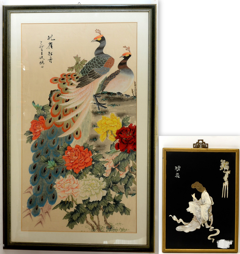 Arte orientale, lotto composto da una stampa su tessuto raffigurante pavoni e peonie e una composizione in madreperla su pannello (cm 88x47 e 39x28) in cornice (difetti)