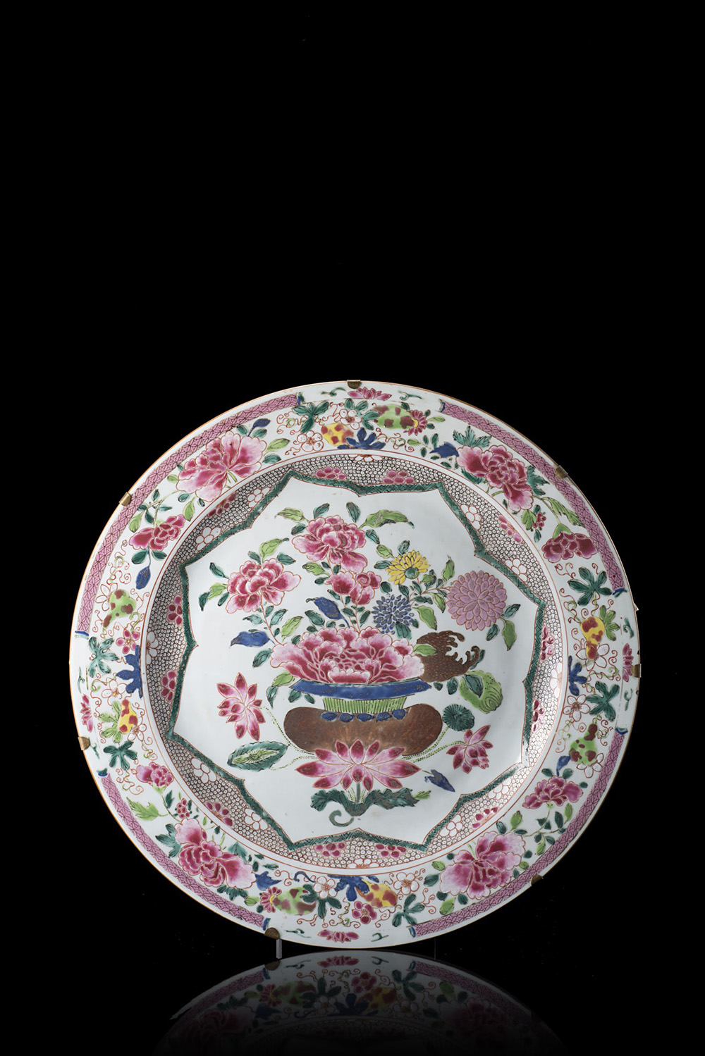 Grande piatto in porcellana con vaso di fiori nei colori della Famiglia Rosa (difetti) Cina, prima met‡ sec. XVIII (diam. 32,5 cm.)