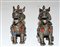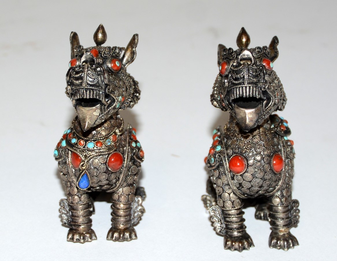 Coppia di contenitori in argento raffiguranti creature mitologiche, decorati con fili d'argento modellati, piccoli inserti in pasta vitrea e cabochon in pietra dura (h cm 8) (difetti)