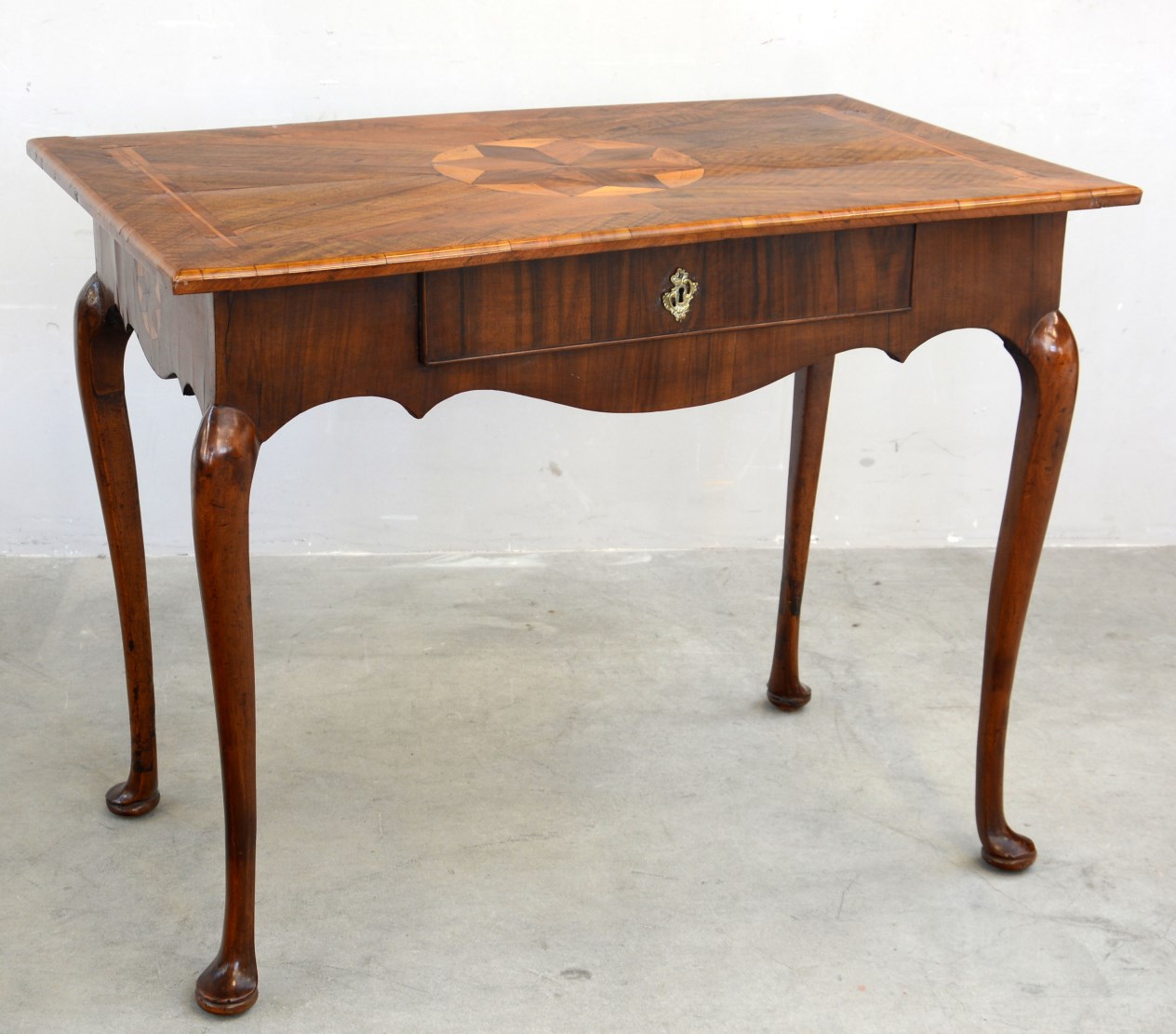 Antico tavolo scrittoio lastronato in noce con fascia sagomata e cassetto, piano filettato e centrato da motivo a stella ripreso anche sui fianchi (cm 103x81x62) (difetti)