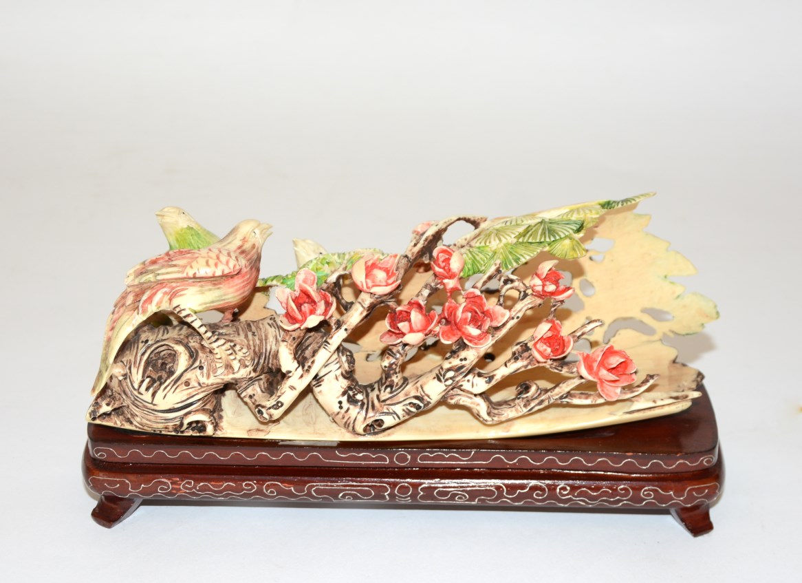 Scultura in avorio raffigurante un tronco d'albero cavo con uccelli, con base in legno, Cina, sec. XX (l cm 20) (lievi difetti)