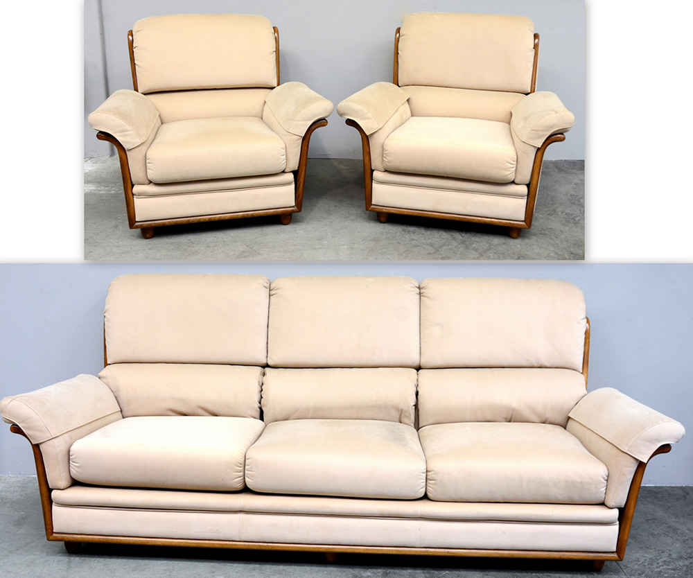 Fornitura da salotto composta da un divano tre posti e due poltrone, struttura con profili a vista in legno e rivestimento in tessuto beige (difetti)