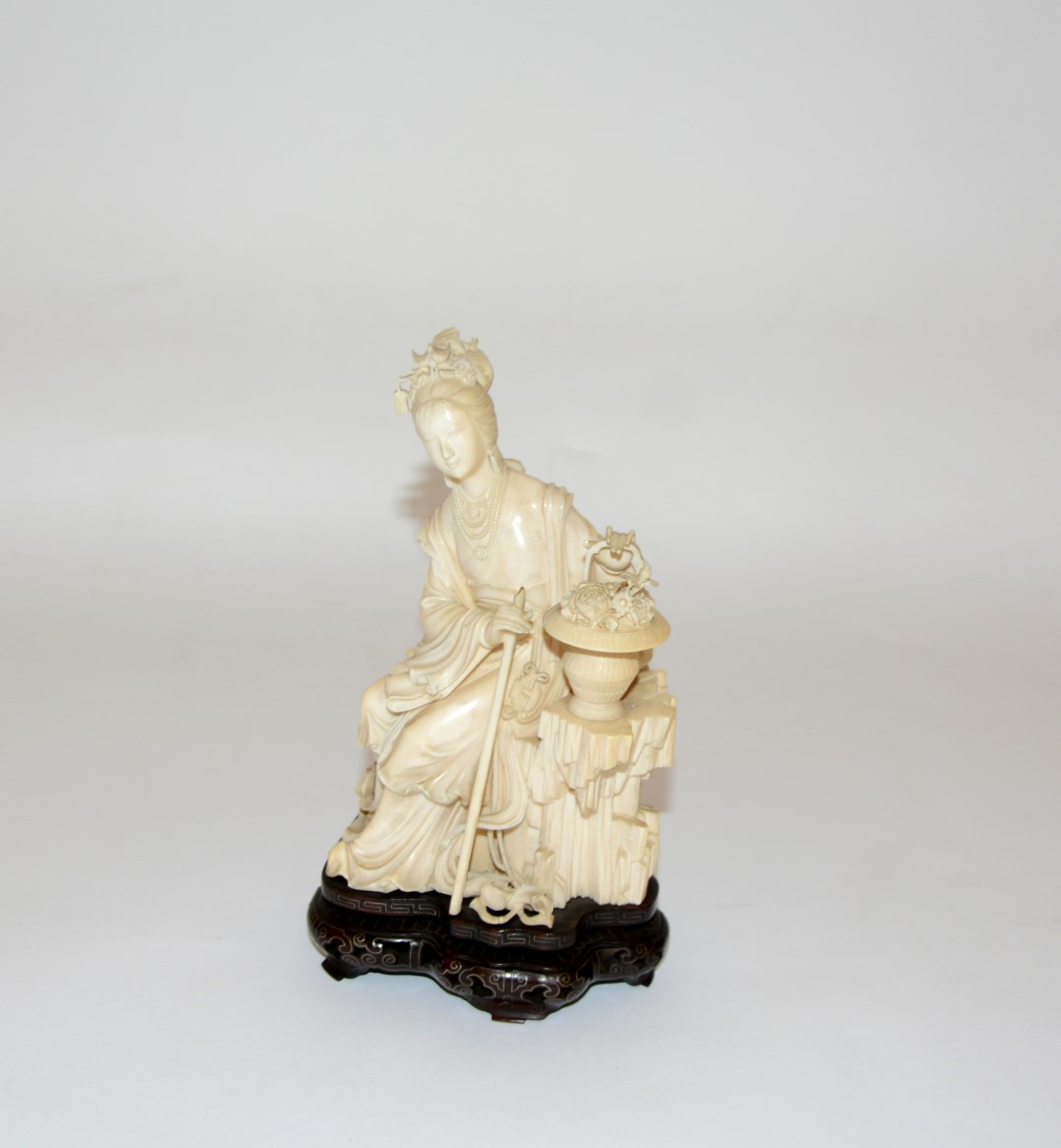 Scultura in avorio raffigurante una fanciulla con cesto di fiori, Cina, sec. XX (h cm 17) (difetti e mancanze)