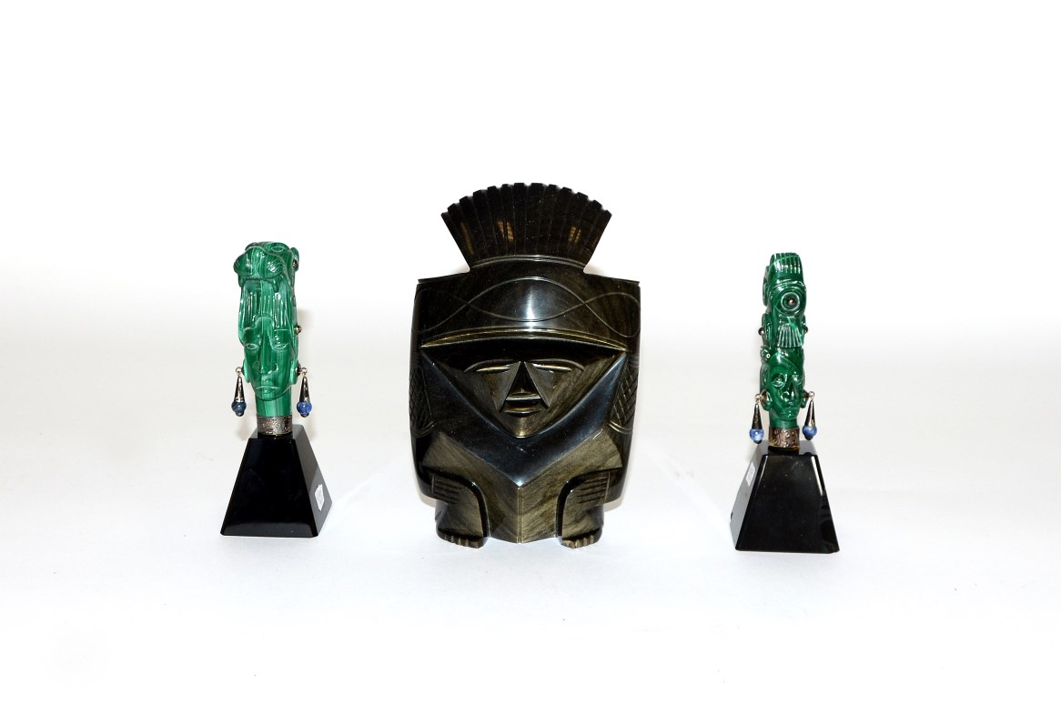 Lotto di tre sculture in pietra dura e malachite raffiguranti soggetti di arte precolombiana (h cm 19 e cm 16 per la coppia) (difetti)