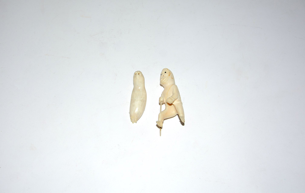 Lotto composto da due statuette in osso raffiguranti cacciatore inuit e foca (lievi difetti)