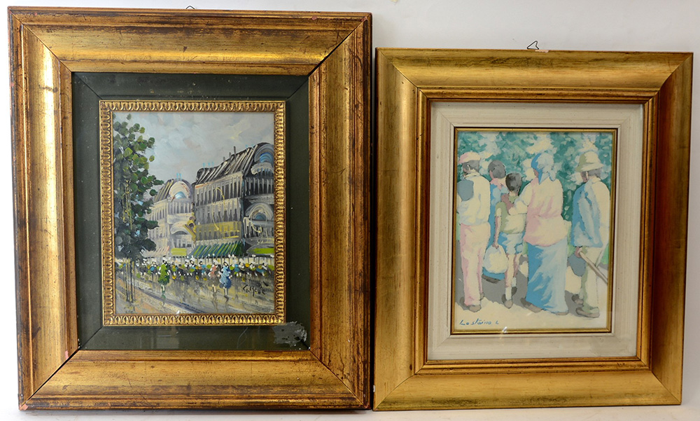 Lotto di due dipinti ad olio di autori differenti raffiguranti figure e uno scorcio di Parigi, misure differenti, in cornici (lievi difetti)