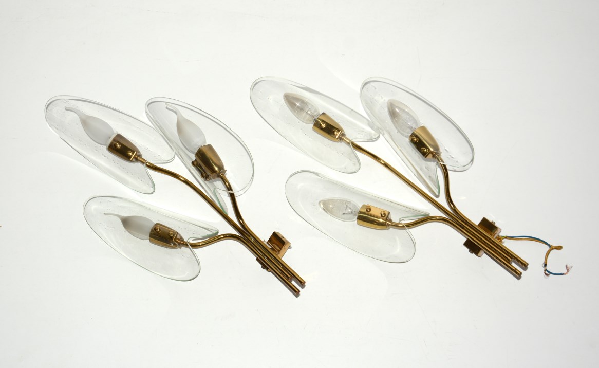 Coppia di appliques a tre luci con struttura in ottone e paralumi in vetro, anni '50 (h cm 51) (lievi difetti)