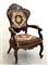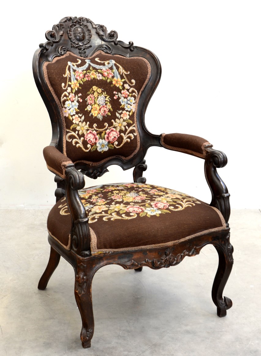 Poltrona Luigi Filippo in noce con cimasa scolpita a stemma rivestita in tessuti a piccolo punto a fiori
