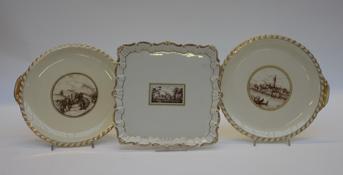 Lotto composto da tre vassoietti in porcellana decorati a paesaggi monocromi,...