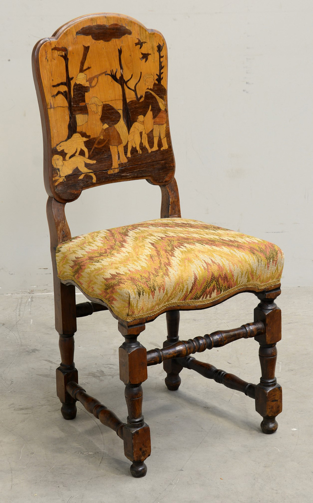 Sedia a rocchetto con schienale intarsiato a scena di caccia