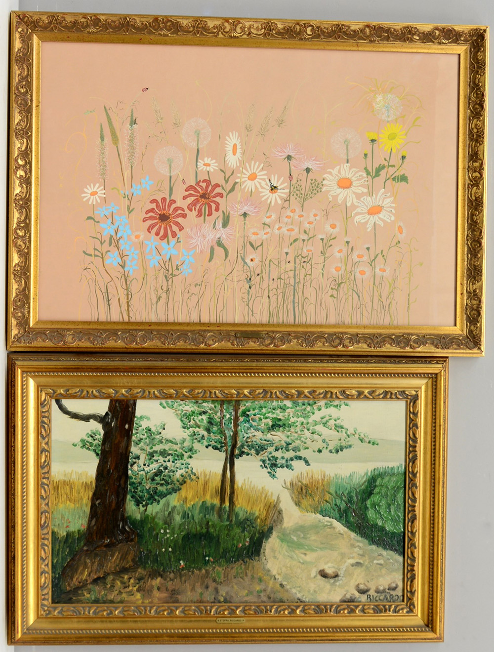 Riccardo Stoppa Lotto composto da un olio su tela raffigurante un paesaggio lacustre e una tecnica mista raffigurante fiori, misure differenti, in cornici (lievi difetti)