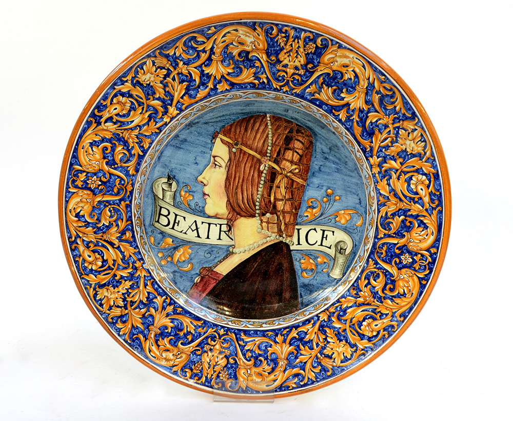 Manifattura di Gubbio, Bargello "Beatrice" piatto in ceramica decorato in policromia (d. cm 41)