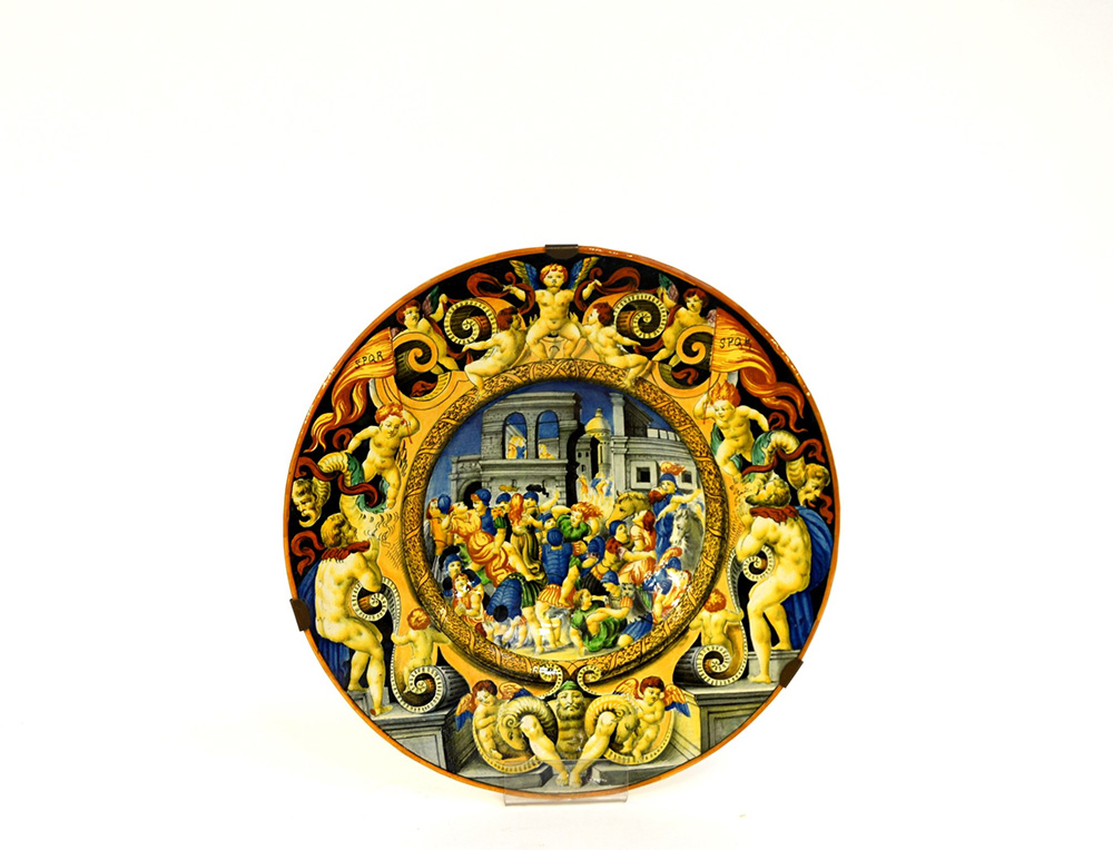 Manifattura Centro Italia. Piatto in ceramica decorato nel cavetto con Ratto delle Sabine e nella bordura a cherubini e raffaellesche (d. cm 30)