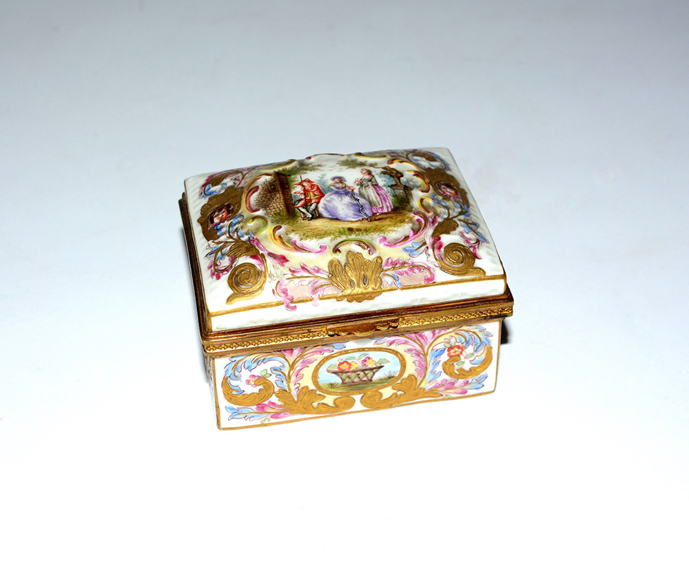 Scatola in porcellana decorata a scene di vita e cesti con frutta entro volute dorate e policrome. Ghiere in metallo cromato. Sec. XIX