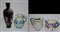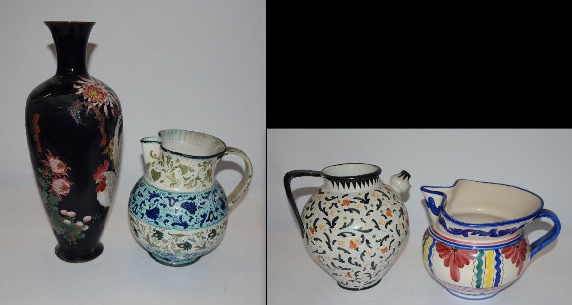 Manifatture diverse. Lotto composto da tre versatoi in ceramica e un vaso in metallo cloissonnË. Italia, sec XX (misure diverse) (difetti e mancanze)