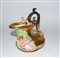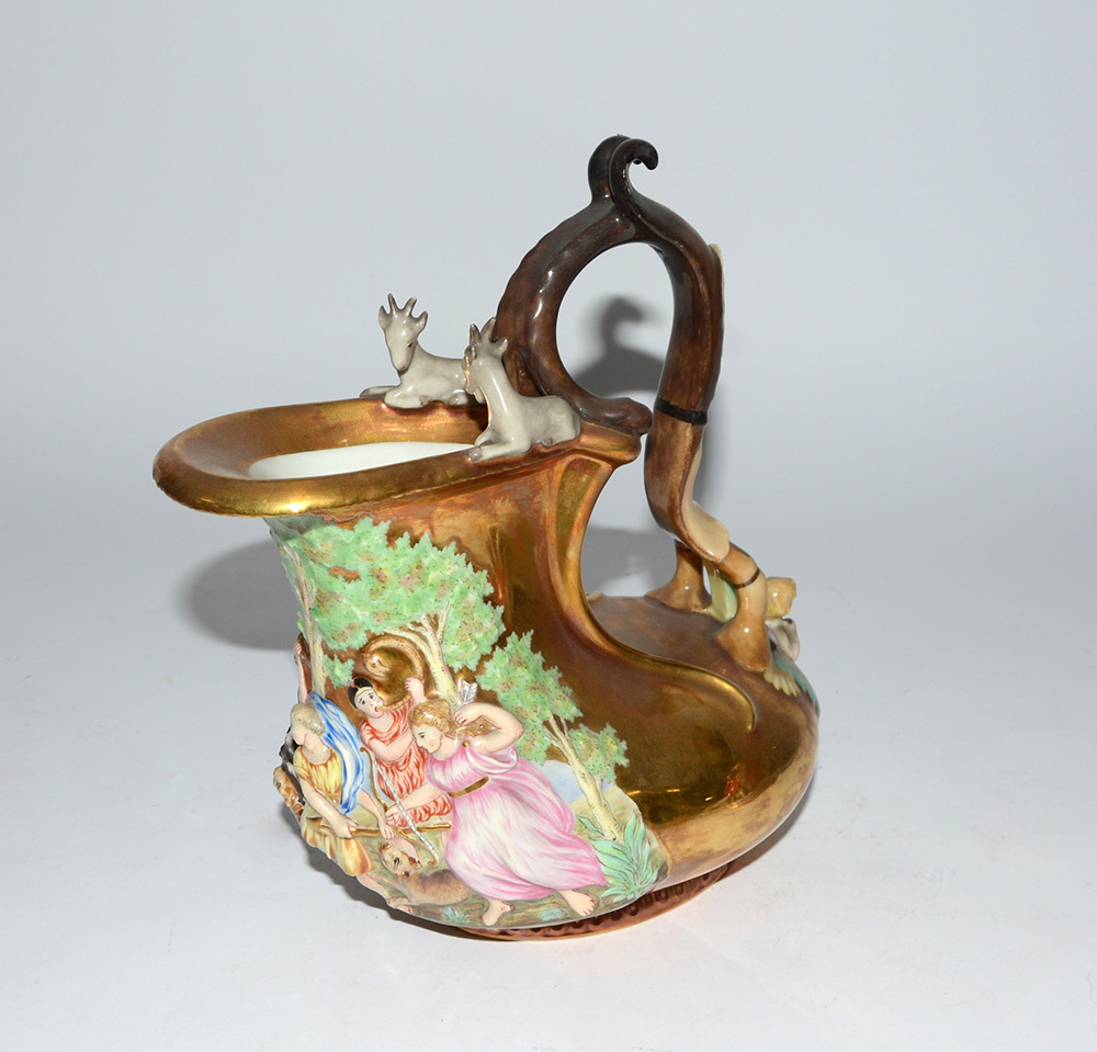 Manifattura italiana. Versatoio in porcellana decorato a fondo oro in rilievo a scene mitologiche. Ansa sormontata da animale