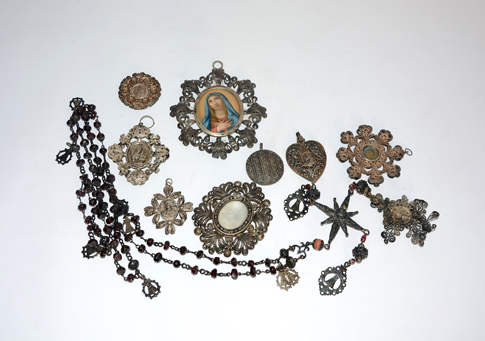 Lotto composto da nove oggetti in argento e filigrana díargento tra cui un rosario, pendenti e cornici (difetti)