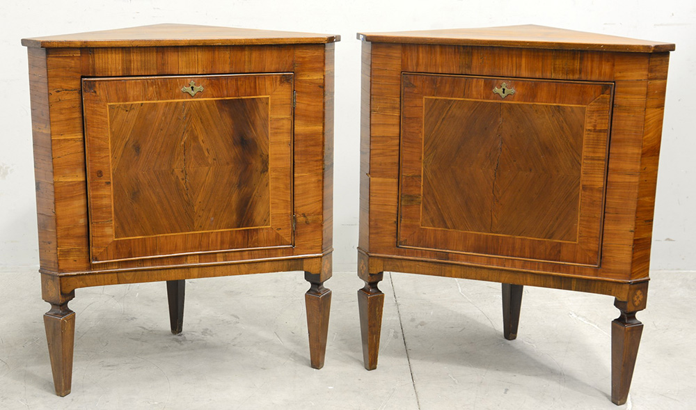 Coppia di angoliere lastronate in noce ad un'anta con piani e fronti filettati. Gambe rastremate decorate all'attacco da rosone. Fine sec. XVIII (cm 84x100x47) (difetti e restauri)