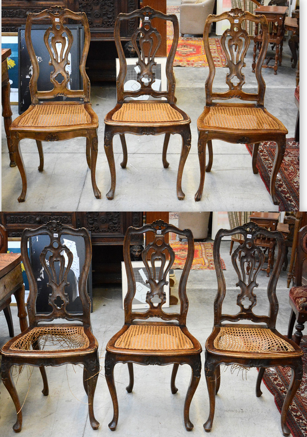 Gruppo di sei sedie con schienale a giorno e cartella traforata fascia e gambe mosse (gravi difetti)