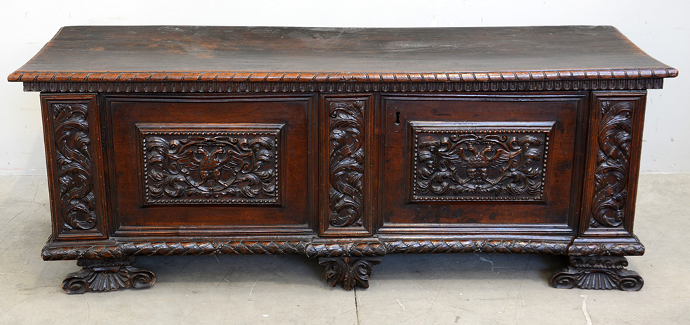 Cassapanca con fronte scolpito ad aquile bicefali e volute fogliate. Piedi a...