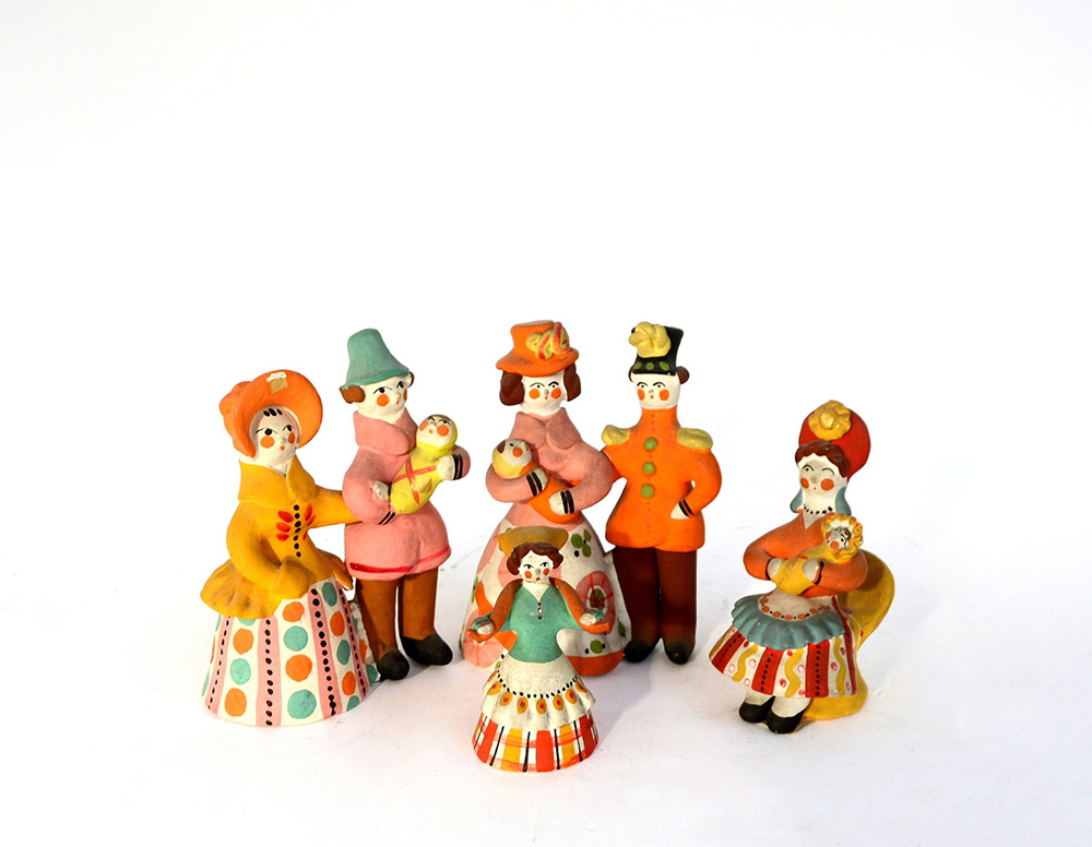 Manifattura russa. Lotto composto da quattro statuette in terracotta decorata in policromia (difetti)