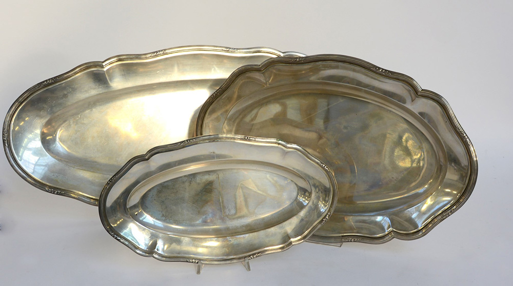 Gruppo di tre vassoi di forma ovale con bordura sagomata in stile impero (largh. max cm 70) (gr. 3800)