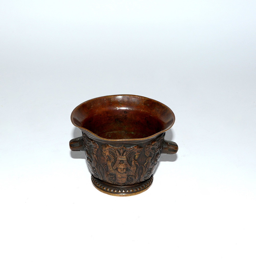 Antico mortaio in bronzo decorato a teste di caprini e cherubini (h. cm 8) (difetti)