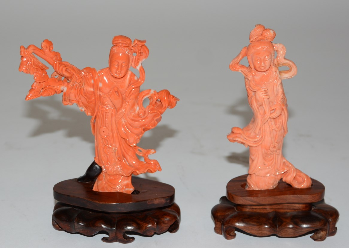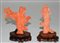 Lotto di due sculture in corallo raffiguranti figure femminili, basi in legno, Cina, sec. XX (h cm 11 ca.) (difetti)