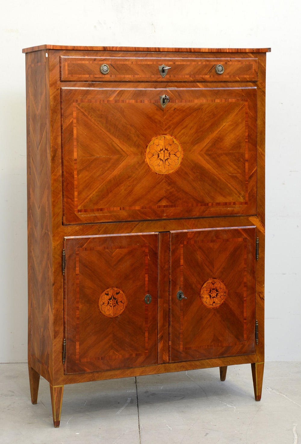 Secretaire lastronato in noce e legni vari ad un cassetto e tre ante di cui quella centrale ribaltabile. Lombardia, sec. XVIII (cm 97x151x39) (difetti e restauri)