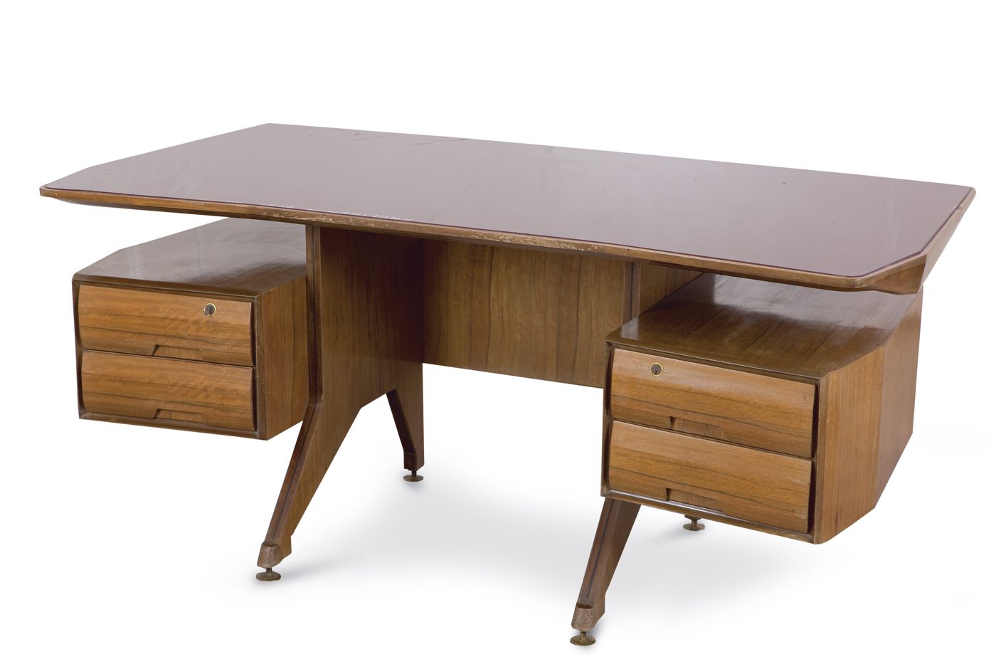 SCRIVANIA - Scrivania in noce con piano in vetro retro verniciato. Piedini regolabili in noce. 1955 circa. Marchio impresso nel cassetto La Permanente Mobili Cantù. cm 79,5x182x91