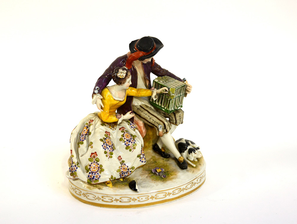 Manifattura tedesca. Gruppo in porcellana decorata in policromia raffigurante scena galante con gabbietta e vane (h. cm 20) (difetti)