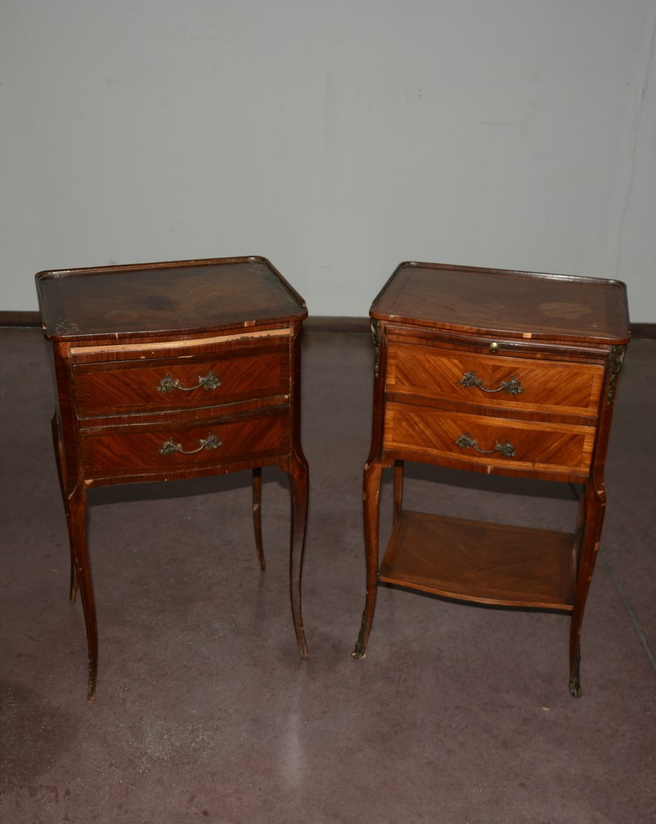 Lotto di due comodini di forma mossa a due cassetti e tiretto sottopiano. Gambe sagomate riunite da pianetto (difetti)