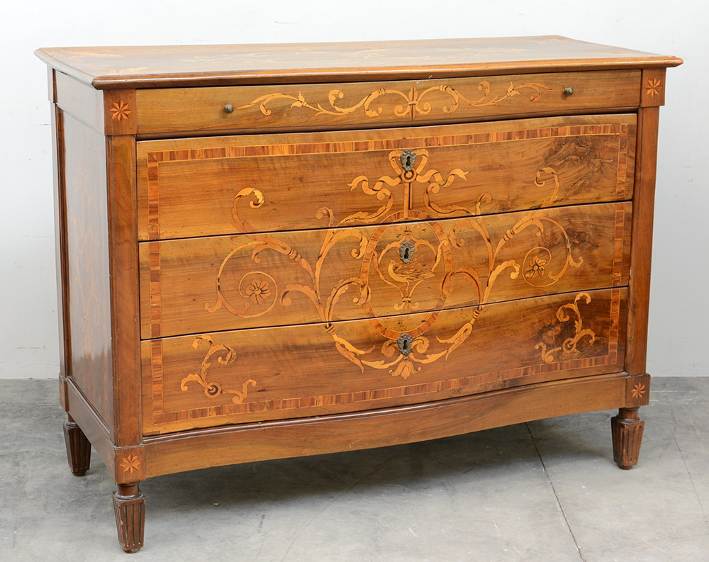 ComÚ a tre cassetti e mezzo con fronte, fianchi e piano intarsiati e...