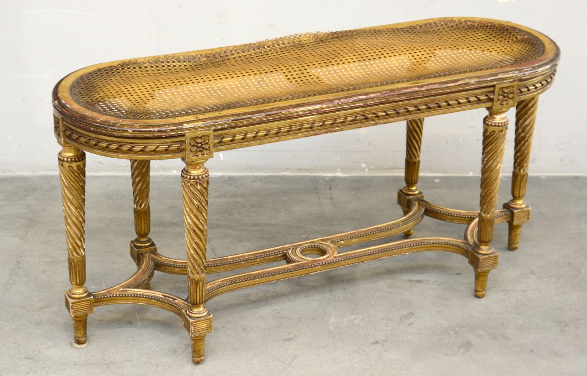 Panchetta in legno dorato con seduta in paglia di Vienna (cm 100x37x50) (difetti)