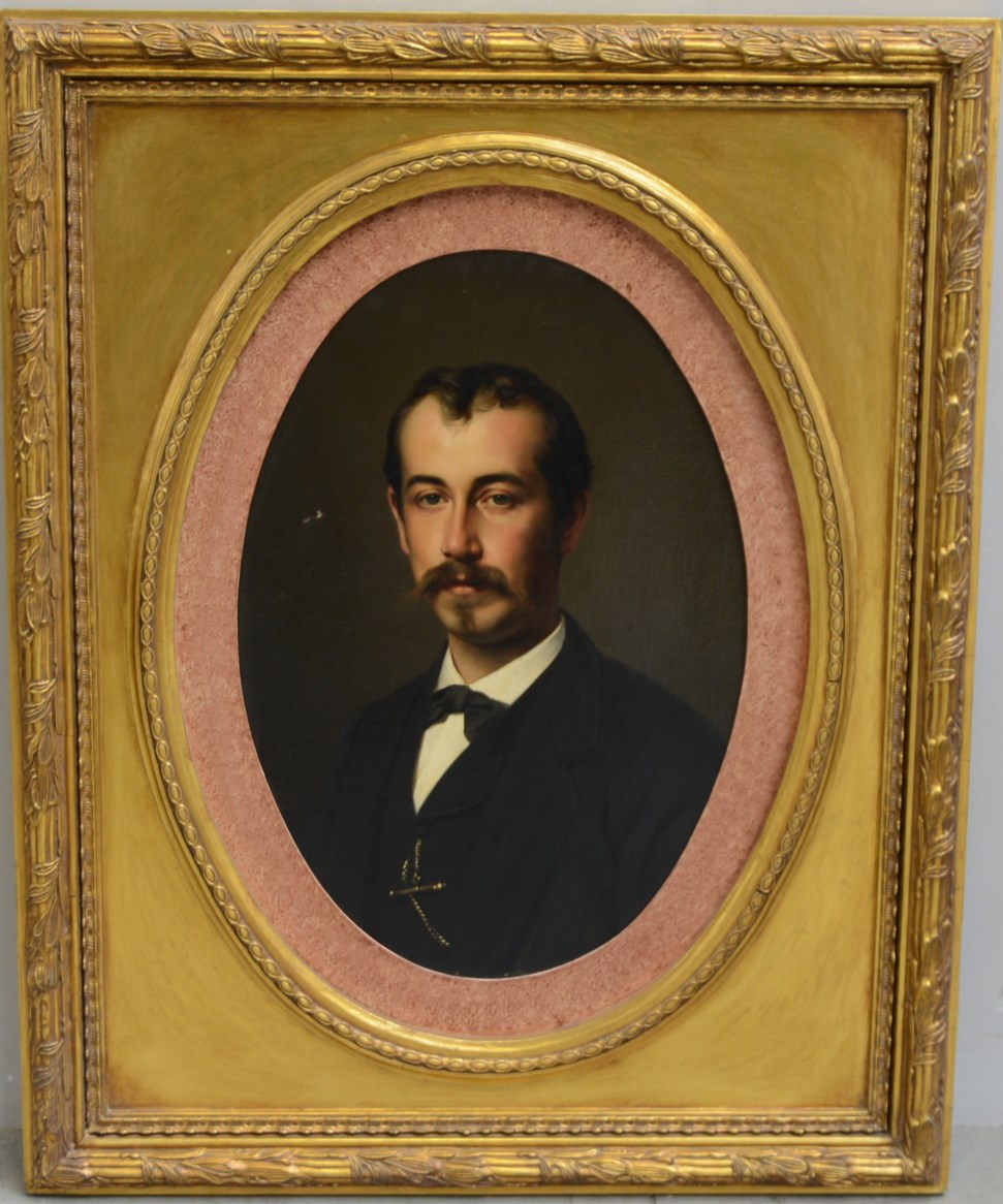 * Scuola del sec. XIX "Ritratto di uomo con baffi" olio su tela ovale (cm 64x56) in cornice dorata (difetti)