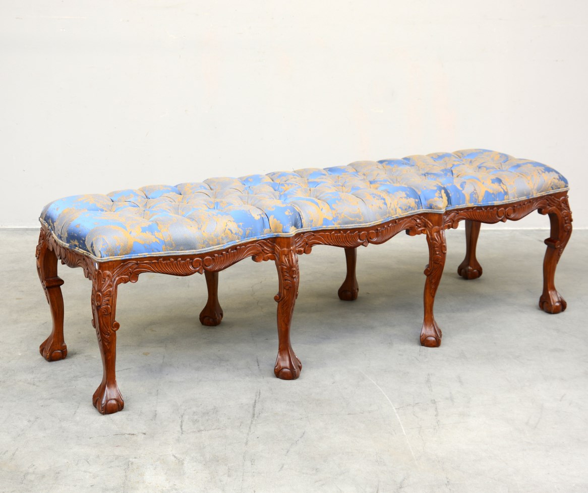 * Panchetto con fascia e gambe intagliate a volute fogliate, piedi ad artiglio (cm 176x50x50)
