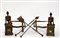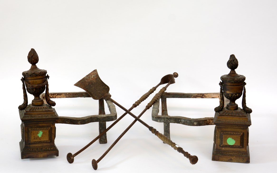 Set da camino composto da due alari sormontati da vasi e due attrezzi. Sec. XIX (difetti)
