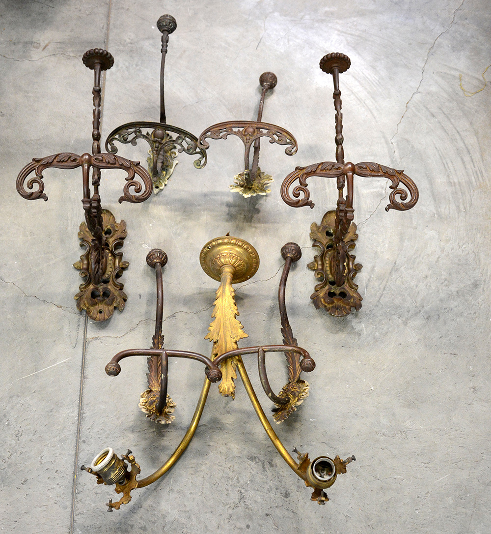 Cartone contenente una applique in metallo e sei appendiabiti in ferro e metallo dorato